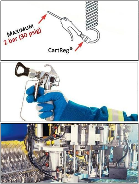 • Genel pnömatik uygulamaları; küçük ve kompak yapısı sayesinde ve ayar değiştirilemeyeceği için geleneksel regülatörlere göre avantajlı . Ayrıca ekonomik ve manometre gerektirmez.
