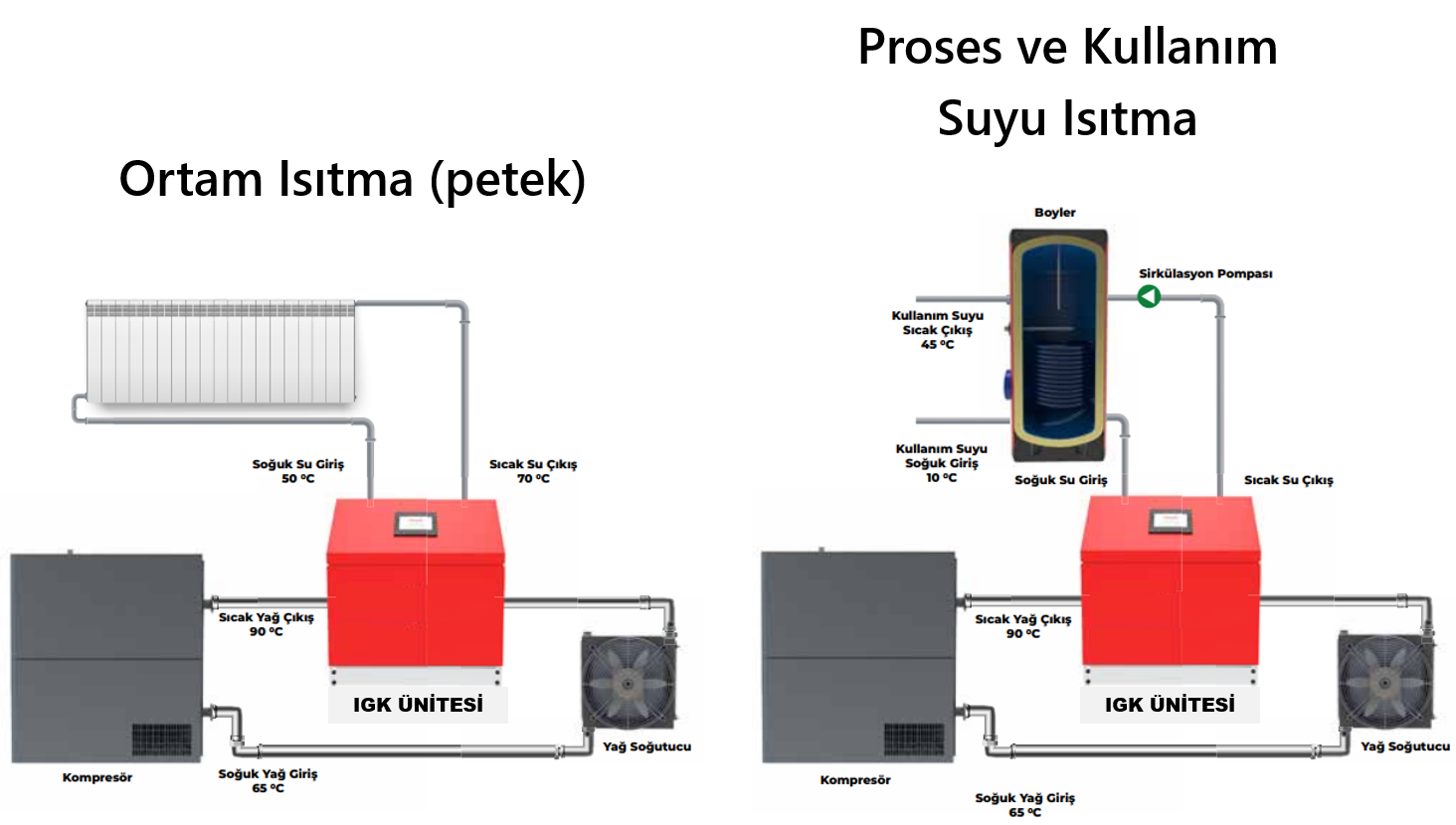 • Aşağıda görüleceği üzere, kompresör atık ısısı genellikle ısıtma sistemi veya kullanım sıcak suyu ısıtılması olmak üzere sıcak su elde etmek üzere kullanılmaktadır.